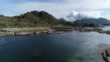 Drone aerial of landscape near Ballstad, Lofoten archipelago with cod drying on racks