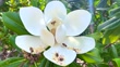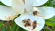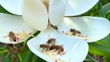Horizontal close up of buzzing bumble bees collecting pollen in summer from white fragrant flower petals with stamen of magnolia tree in bloom at spring Australia