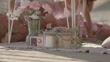 Slow motion handheld shot of gentle pink flowers in vase with small retro radio and candles placed on blanket in sunlight during event celebration