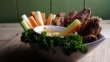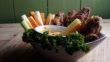 Eine Schüssel mit gesunden gebackene gegrillte Hähnchenflügel begleitet von Hot Sauce Sellerie und Karotten-Sticks - 4K Stock-Video