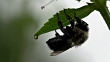 A bumble bee hold onto a green leaf with a dewdrop, high speed closeup