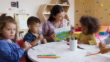 Fröhliche Lehrerin gibt ihrer vielfältigen Kindergartenklasse während des Kunstunterrichts Anweisungen - Schulkonzepte