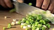 HD1080 Frühlingszwiebeln hacken für Salat. Nahaufnahme. Stativ.