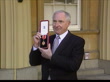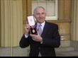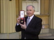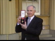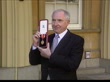 Gay rights: civil partnership bill; LIB (TX 26.12.2001/ITN)EXTSLOW MOTION Sir Nigel Hawthorne (Actor whose partner faced a big inheritance tax bill when he died) posing with medal at Buckingham Palace