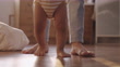 Nahaufnahme der Babybeine, die mit der Hilfe der Mutter zu Hause die ersten Schritte machen. Asiatischer kleiner Junge hält Händchen haltend mit seiner Mutter und lernt zu Hause Schritt für Schritt zu laufen. Nahaufnahme von Babybeinen, die die ersten S - 4K Stock-Video
