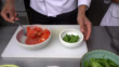 Nahaufnahme des unkenntlichen Küchenchefs, der einen Salat zubereitet - 4K Stock-Video