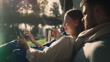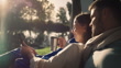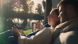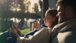 Paar Camping, Tablet und glücklich im Zelt, morgens und entspannen Sie sich am See, Fluss und Kaffee im Urlaub in der Natur. Mann, Frau und Getränk mit Lesebenachrichtigung, Video oder Social Media im Urlaub im Wald - 4K Stock-Video