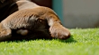 Super slow motion long shot of a dog wagging its tail while lying in grass.