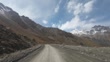 Driving down from mountain pass surrounded by snowcapped mountains covered by autumn forest. Car point of view