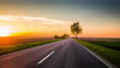 POV shot of car driving on a rural road in Germany. Back lit by warm sunlight at sunset.