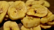 Slide Shot von trockenen Bananenchips auf Holzschreibtischhintergrund.