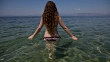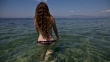 Rückansicht einer jungen kaukasischen Frau, die ins Meer geht und einen schönen Sommertag am Strand genießt.