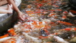 Father and son share a peaceful moment by the pond, the father gently feeding colorful koi fish as they gather.