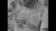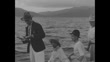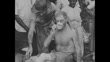 Title Card: "Flee Devil's Island" / Title "Port-of-Spain, Trinidad" superimposed over pan shot of Port of Spain, Trinidad / boat arrives with seven men / CU beaching the craft / CU men pushing boat ashore / refugees shaking hands with local people / MS two men carry exhausted man off boat to shore / CU elderly man takes drink of water / Close pan of escaped prisoners sharing banana / CU tilt down of tattoo on man's chest / CU words tattooed on man's back "Born to suffer" / PAN prisoner helped into the constable's office / CU local police, prisoners who have come to this hospitable port for nourishment and rest, only to be told that they must go elsewhere / man giving money to the prisoners, shaking hands with them / little boat pulls away from dock / MS prisoners on boat being towed, waving their hats / WS broad horizon before them / Note: exact day not known