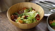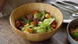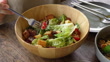 Caesar salad being eaten with fork from wooden bowl, featuring fresh greens, cheese, and croutons. Concept of healthy food, clean eating, balanced diet, and wellness lifestyle.