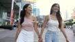 Two smiling women holding hands while walking through a city street during an LGBTQ+ pride celebration. They wear casual outfits with rainbow bracelets, expressing joy, love, and solidarity in support of equality and diversity.