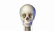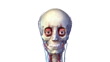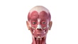 Animation revealing the anatomy of the human face. The outer layers of skin and hair fade to show the muscles of the face, which fade to show the bones of the skull and spine. The arteries (red) and veins (blue) supplying the head with blood appear next. then the eyes, then the outer (left) and inner (right) muscles. The outer layer of muscles underlay the skin, which reappears at the end of the clip