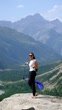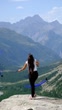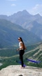 Juggling in the mountains with an attractive young girl on a rock with a valley backdrop.