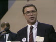 Brighton: Labour Party Conference: Day 2; ENGLAND: Brighton:Defence Debate:Delegates in hall/black and white CND banner draped over balcony:Ex leaders Michael Foot & Jim Callaghan seated:Gerald Kaufman (Shadow Foreign Sec) speech ((Shares objective of nuclear free Britain/Wants Labour Britain to play part in bringing about nuclear free world):Ron Todd (TGWU) applauds gently:Banner held by delegates "Peace without War":Woman delegate with yellow & black CND banner by her:Trade Union leaders Gavin Laird, Bill Jordan & others chatting on floor:Bruce Kent CND to podium wearing CND badge:Speech (1 death in three every year is a child under the age of three yet trillions spent on weapons):Arthur Scargill & delegates applaud:Neil Kinnock, Roy Hattersley, Larry Whitty applaud:Kent across floor from podium:Tony Benn (Labour Chesterfield MP) to podium - wearing CND badge - speech (Reference to Aneurin Bevan; We have never been invited to the top table in disarmament):Kinnock listening:Sylvia Heal (Surrey North West) speech (Not prepared to put election of Labour govt at risk by clinging to unilateralism/no apology for considering electoral chances):Bill Jordan (AEU President) speech (Composite 48 paper promise of peace as worthless as the Neville Chamberlain piece of paper):Joan Ruddock holding hand up to be called:Joan Ruddock MP (Lewisham Deptford) speech (Accepts majority decision but cannot change her view):Hand vote:Kinnock shrugging shoulders:Neil & Glenys Kinnock down stairs of hotel followed by ex ITN reporter Julie Hall/Kinnock stops and comments on the day as standing next wife/out hotel/Kinnock signs autograph book:
