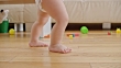 Slow motion medium handheld shot of the legs of a barefoot baby walking towards the living room. Shot in Slovenia.