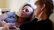 LGBT lesbian young married couple cuddling in bed. Early morning, chatting, cuddling and kissing.