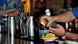 Barkeeper macht Bubblegum-Cocktail zu Glas auf der Bartheke - Sahne mit blauem Curracao und Eis ins Glas gießen
