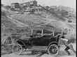 B/W 1925 man (Billy Bevan) pushing car toward edge of cliff / houses + horses in background / feature - Stock-Video