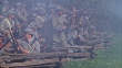 MEDIUM ANGLE OF CONFEDERATE CIVIL WAR SOLDIERS WITH RIFLES SHOOTING ACROSS FIELD. GUNFIRE. MEN FALL TO GROUND. WOUNDED. COULD BE BATTLEFIELD. STUNTS.