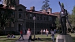 MEDIUM ANGLE OF POMONA COLLEGE CAMPUS. SEE STATUE, LAMPPOST. SCHOOL BUILDING IN BACKGROUND. STUDENTS PLAY FOOTBALL ON LAWN.