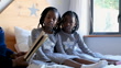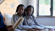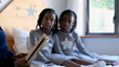 Tight shot of a mother sitting and reading a book to her two young twin daughters. The twin girls are sitting on their bed listening to the story book.