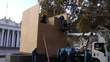 ODESA, UKRAINE - OCTOBER 30: Municipal workers cover the monument to Russian poet Alexander Pushkin with wooden boards on Prymorskyi Boulevard on October 30, 2025 in Odesa, Ukraine. The monument to Alexander Pushkin in Odesa was erected in 1887-1889 on Primorsky Boulevard with funds from the City Duma and donations from Odesa residents. It was third monument erected in Odesa. (Footage by Viacheslav Onyshchenko/Global Images Ukraine via Getty Images)