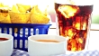 Nachos mit Käsesauce, Jalapenos, Salsa und Cola
