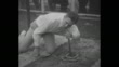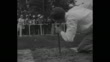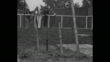 Title card: "News Flashes!" / two shots of row of contestants tossing horseshoes / ground level shot from horseshoe stakes as contestant tossing horseshoes rings two stakes / close shot of horseshoes ringing two stakes / contestant holding horseshoes ready to toss one / shot from behind man who has chin on top of stake as man tosses horseshoes and rings two stakes / shot from different angle of same man with chin on top of stake as two horseshoes ring stake / Note: exact day not known