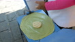 Medium shot high angle view of woman making fresh corn tortillas with press at outdoor street food stall in Oaxaca