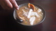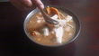 Paste of rice flour or boiled Chinese pasta square with pork in brown soup