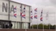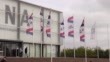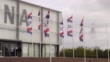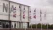 FLENSBURG, GERMANY - MAY 5: People walk past the Flensarena as flags fly in front of it, ahead of the LIQUI MOLY HBL match between SG Flensburg-Handewitt and FRISCH AUF! Göppingen at Flensarena on May 5, 2022 in Flensburg, Germany. (Footage by Martin Rose/Getty Images)
