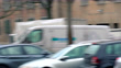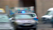 Polizeiauto fährt mit hoher Geschwindigkeit eine Stadtstraße entlang. Die Signalleuchten blinken.