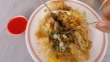Thailändische Küche, handgegossene Chilisauce auf Thai traditionelle Pfanne gebratene knusprige Muschel in Eierteig oder Muschelpfannkuchen serviert mit Bohnensprossen und gehackter Frühlingszwiebel. Eines der beliebtesten Gerichte in Thailand.