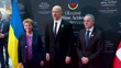 LAUSANNE, SWITZERLAND - OCTOBER 17: (L-R) Prime Minister of Ukraine Denys Shmyhal, President of the Swiss Confederation Viola Amherd and Federal Councillor and Head of the Swiss Federal Department of Foreign Affairs Ignazio Cassis pose for a photo during the Second Ukraine Mine Action Conference on October 17, 2024 in Lausanne, Switzerland. With Ukraine being one of the most mined countries in the world, innovations, such as robots, drones and artificial intelligence, are making it possible to speed up the demining process. Such was discussed during the Second Ukraine Mine Action Conference. This year, it was attended by representatives of more than 50 countries. (Footage by SLM News/Global Images Ukraine via Getty Images)