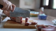 Close up shots of Asian woman preparing cuts of pork with a knife.