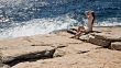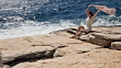 Junge kaukasische Frau, die auf den Felsen am Meer sitzt und einen Schal mit geöffneten Armen hält und Freiheit ausdrückt.