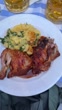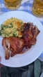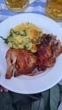 Roasted chicken with potato salad and beer on a restaurant table