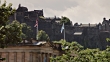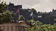Der Union Jack und der Saltire fliegen über die Scottish National Gallery, über der die Mauern des Edinburgh Castle stehen.