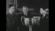 [Shaky video throughout] Title card: "Rockne team gets highest grid prize, New York - Mayor Walker presents Erskine Championship Trophy to quarterback Carideo" / standing behind trophy on table left to right, New York Mayor Jimmy Walker, Notre Dame coach Knute Rockne, quarterback Frank Carideo and two other men, SOT Walker commends Carideo / [no audio this point on] MS Walker, Rockne, Carideo with trophy; Walker continues talking; closer shot of Carideo speaking