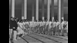 Shot of Venezuelan flag flying atop flagpole, tilt down to group of fencers standing in front of Venezuelan military school / Bolivarian Games women fencers standing in group give salute with swords, pan across to group of male fencers giving salute / Gabriel Blando of Colombia on left and Emilio Etcheverry of Colombia on right fence with one anther in finals match / CU Etcheverry fencing / winner Blando on left and Etcheverry on right take off masks and give salute, posing for photo opportunity, judge standing between them / Note: exact day not known