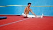 Der 20-jährige Mann arbeitet drinnen. Er bereitet sich auf die Turn-WM vor