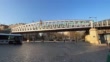 A wide camera shot of a train moving along a subway bridge above a street in Paris, France