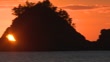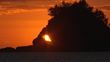 6:00 AM, November 21, 2023, CU shot; silhouette of the uninhabited island "Taijima", with the rising sun shining through its hole; the island shaped like a sea bream, making it look like a "Kinmedai" (splendid alfonsino, scientific name Beryx splendens) meaning golden-eyed sea beam; PAN-left