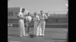 Title "Beverly Hills, Calif. - Paramount News" superimposed over spectators seated behind fence of tennis court, man watching with cigar in mouth / Groucho Marx gets out of sleeping bag on court and is handed ping pong paddle / Ellsworth Vines, Marx, Charlie Chaplin, and Fred Perry on court holding tennis rackets / closer shot, Chaplin shaking hands with Marx / Lady Sylvia Ashley and Constance Bennett greet others / CU Bennett wearing sunglasses / Vines and Marx play doubles match against Chaplin and Perry / CU Paulette Goddard smiling filming with movie camera, men behind her / Chaplin serving, then returning / Marx returning ball, people watching in bg / Ronald Colman looking dapper, others around / Perry and Chaplin playing, people watching in fg / CU side view Douglas Fairbanks / Chaplin hits ball out of bounds and swings racket in disappointment as he and Perry win match / players all sit on sidelines, photographers move in / all shots repeat without sound