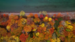 Top view focusing on the autumn colorful foliage blanketing the hills, situated just beside the viridian waters of the lake. Watch as gentle waves traversing the land, adding movement and life to the scene of Towada Lake, Tohoku, Aomori.